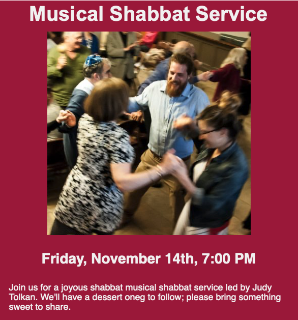 Join us for a joyous shabbat musical shabbat service led by Judy Tolkan. We'll have a dessert oneg to follow; please bring something sweet to share.